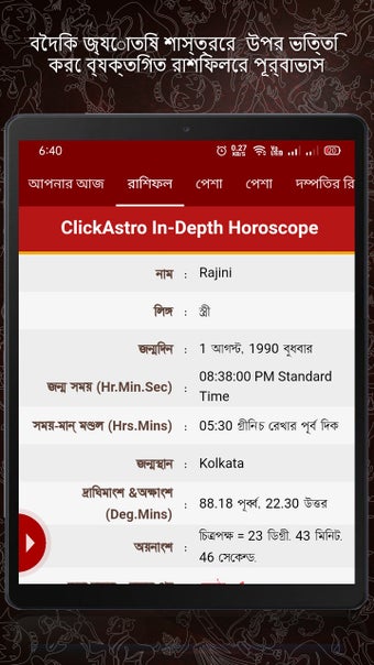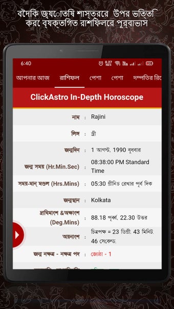 Med funktioner som daglig rashifal, Bangla panchang och online konsultationer med astrologer, fungerar appen som en omfattande guide för daglig planering och framtidsprognoser. Användare kan också spara sina köpta rapporter för offline-användning, vilket gör det enkelt att referera till tidigare analyser. Denna app är ett innovativt verktyg för den bengali talande gemenskapen som söker djupare insikter i sina liv genom astrologi.